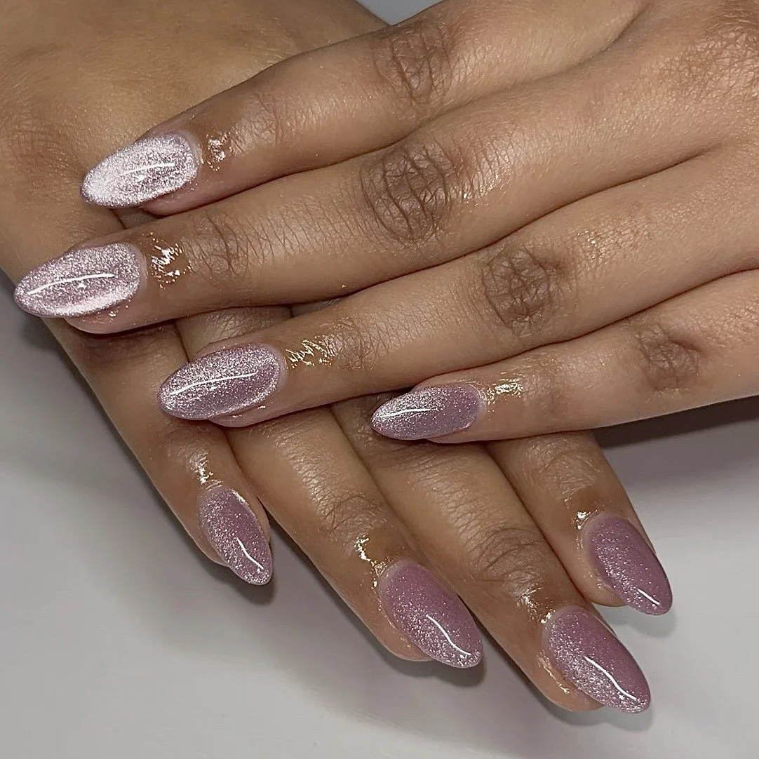 One feature nail on each hand, one gem on each hand, and glitter on any nails.